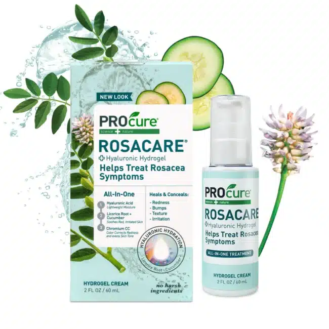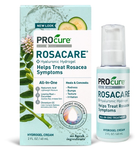 PROcure Rosacare Gel Powerful, lightweight hydrogel contains hyaluronic acid, allantoin, vitamin E, cucumber extract, and licorice-root extract for superior moisturizing and cool, soothing relief to reddened skin. Chromium color correcting helps even out skin’s appearance without a masking effect.